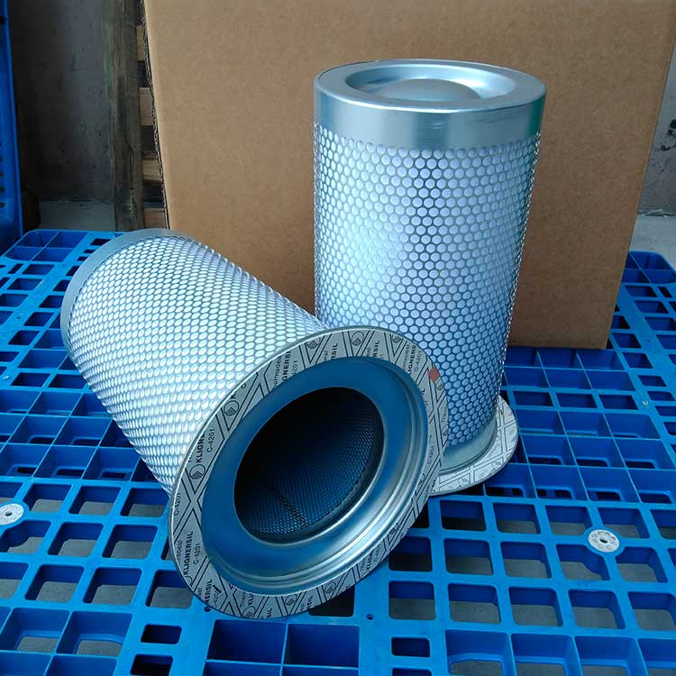 油氣分離元件是決定空壓機壓縮空氣品質的關鍵部件,高質量的油氣分離元件不僅可保證壓縮機的高效率工作,且濾芯壽命可達數千小時。從壓縮機頭出來的壓縮空氣夾帶大大小小的油滴,大油滴通過油氣分離罐時易分離,而小油滴(直徑1μm以下懸浮油微粒)則必須通過油氣分離濾芯的微米級玻纖濾料層過濾。油微粒經過濾材的擴散作用,直接被濾材攔截以及慣性碰撞凝聚等機理使壓縮空氣中的懸浮油微粒很快凝聚成大油滴,在重力作用下油凝聚在油分芯底部,通過底部凹處回油管進口返回機頭潤滑油系統,從而使壓縮機排出更加純凈無油的壓縮空氣。壓縮空氣中的固體粒子經過油分芯時滯留在過濾層中,這就導致了油分芯壓差(阻力)不斷增加。隨著油分芯使用時間增長,當油分芯壓差達到0.08到0.1Mpa時,或者壓縮空氣出口產生明顯的含油量時,濾芯必須更換,否則增加壓縮機運行成本(耗電或耗油)。