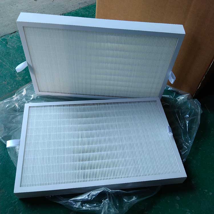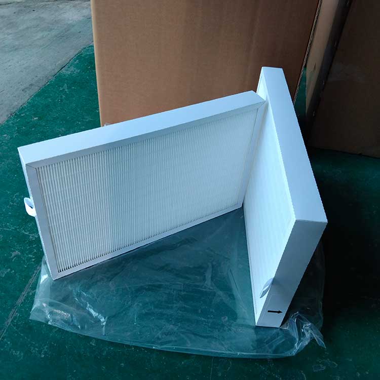 過濾材料是以折疊形式裝入高強度模切硬紙板內,迎風面積增大。流入的空氣中的塵埃粒子被過濾材料有效阻擋在褶與褶之間。潔凈空氣從另一面均勻流出,因此氣流通過過濾器是平緩和均勻的。視過濾材料不同,它所阻擋的粒徑從0.5μm到5μm而不同,過濾效率也不同 。